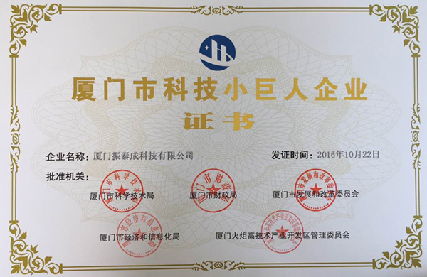 熱烈祝賀我公司廈門振泰成科技有限公司于2016年10月獲得獲得“廈門市科技小巨人”的榮譽(yù)證書,謝謝廈門市科學(xué)技術(shù)局、廈門市財政局、廈門市經(jīng)濟(jì)和信息化局、廈門火炬高新技術(shù)產(chǎn)業(yè)開發(fā)區(qū)管理委員會和廈門市發(fā)展和改革委員會對我司的高度肯定!